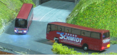 Ganz zu schweigen von den vielen Einstellmöglichkeiten für die Motorsteuerung. Mit welcher Geschwindigkeit soll ein Fahrzeug anfahren oder abbremsen, oder wie lange soll ein Bus an einer Haltestelle halten? Was in der Realität bisher nur bedingt realisiert werden konnte – das automatische Abbremsen und wieder Anfahren hinter einem vorausfahrenden Fahrzeug – hier ist es bereits Bestandteil unseres Digitalsystems auf der kleinsten unserer Spurweiten. Damit das Folgefahrzeug nicht ruckartig beschleunigt oder abbremst, wird vom vorausfahrenden Fahrzeug über die Infrarotschnittstelle – vereinfacht ausgedrückt - die derzeitige Geschwindigkeit übermittelt und im nachfolgenden Bus entsprechend verarbeitet um eine möglichst homogene Fahrweise zu erzielen.