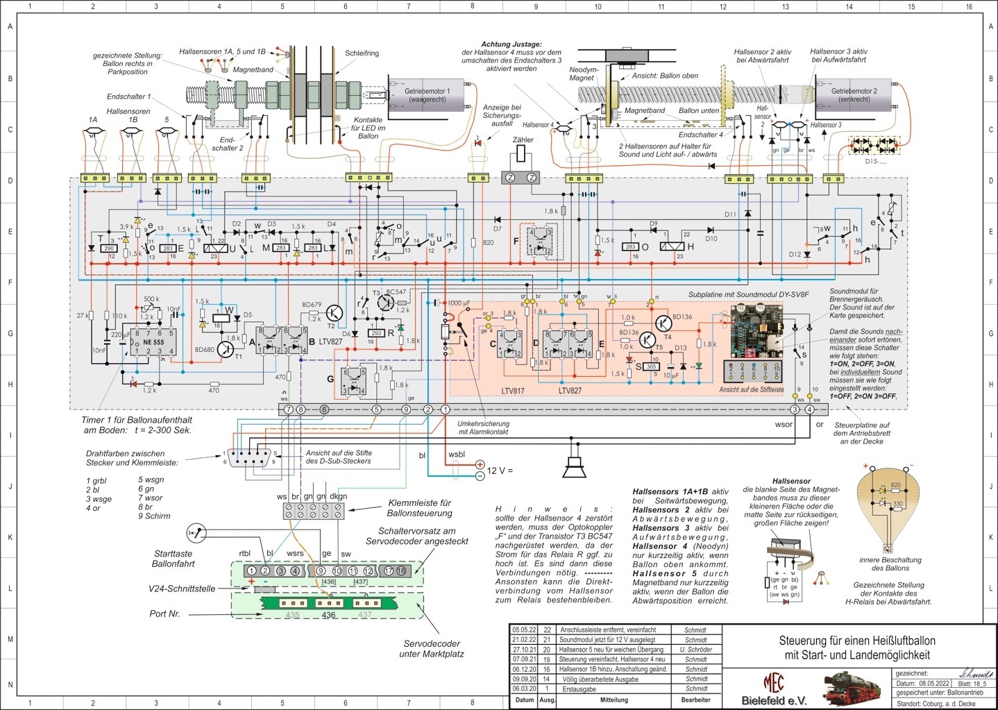 Irgendwo zwischen diesen beiden Endpunkten befindet sich ein verstellbarer Hallsensor, der durchschaltet, wenn die auf einer Messingfeder oberhalb der Mutter montierten Magneten vorbeigeführt werden. Ein weiterer Sensor (H 1B), befindet sich vor der linken Wickelspule, auf der ein Magnetband aufgeklebt wurde. Beide Hallsensoren sind in Reihe geschaltet. Zweck ist, eine realistischere Dauer sowohl des Brennergeräusches als auch des Brennereffektes zu erzielen; denn nur, wenn beide Hallsensoren vor dem Magnetstreifen an der Spule und der Sensor auf der Mutter gleichzeitig angeregt werden, wird der nachfolgend noch näher beschrieben Vorgang ausgelöst und sowohl das Soundmodul angeregt als auch die 3 LEDs im Ballon als Brennerlicht eingeschaltet. Durch diese Art der Einschaltung wird eine unterschiedliche Aktivierung und damit eine realistischere Darstellung sowohl des Lichtes als auch der Geräusche erzielt. Damit bei einer Steigung die Geräusche länger und öfter ertönen als bei einer Landung, werden unterschiedliche Hallsensoren angesprochen.
